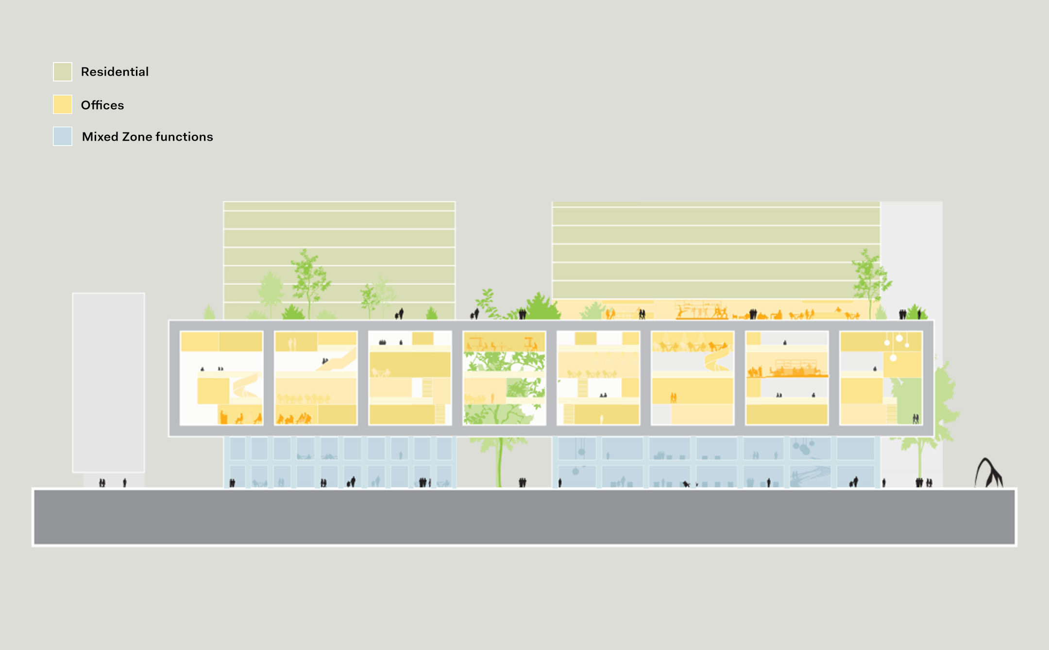 On the ground floor, The Modernist is directly in contact with what’s happening on the street. Its relationship with the outside is so strong because the enormous framework of the offices above the plinth acts as a colossal window to the city: it literally brings the inside closer to the outside. Within this framework, there is enough room for four office floors with lettable areas of up to 3,000 m2 per floor. These spaces can be arranged flexibly and dynamically thanks to the modular design. This freedom in determining the position of the floors, atria, stairways and walls allows you to create a fully customised working environment; anything from experimental and dynamic to pragmatic – and everything in between.